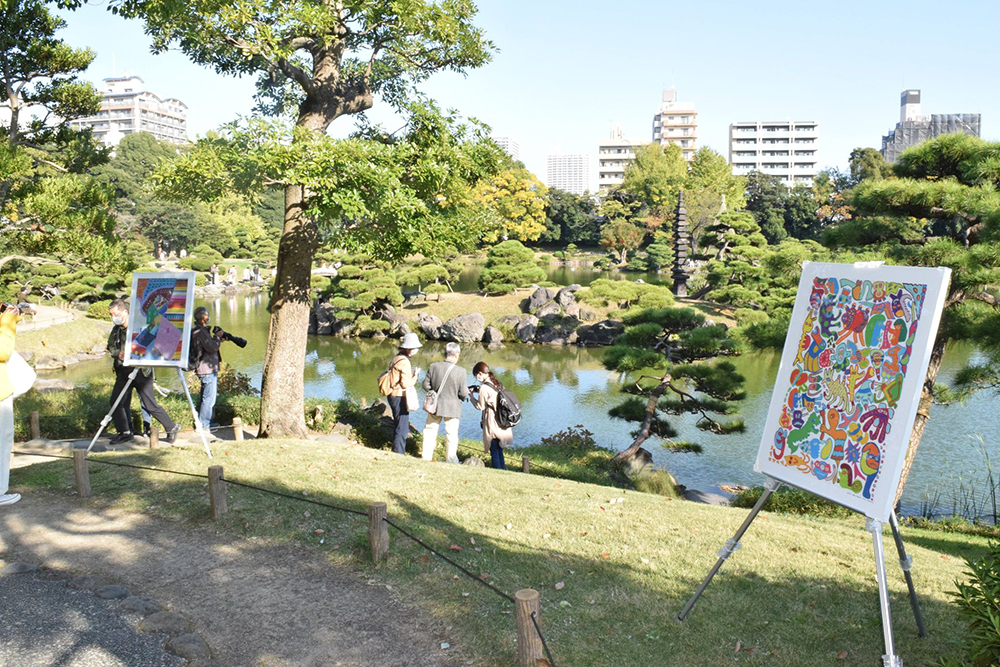 華道家、假屋崎省吾氏のいけ花と昨年度アートパラ深川コンペディション入賞・入選作品アート、紀伊国屋文左衛門の屋敷跡と伝わる都名勝の清澄庭園とのコラボ。
