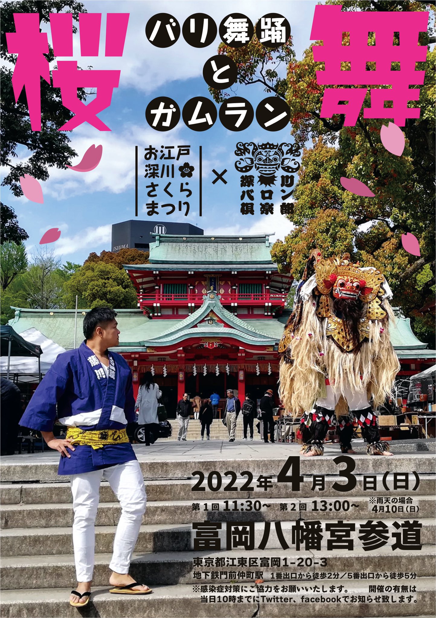 また、期間中4月3日(日)には深川バロン倶楽部が富岡八幡宮でバリ舞踊とガムラン演奏「桜舞」を披露します。時間は11時30分・13時の2回(雨天の場合は4月10日(日)に延期)。