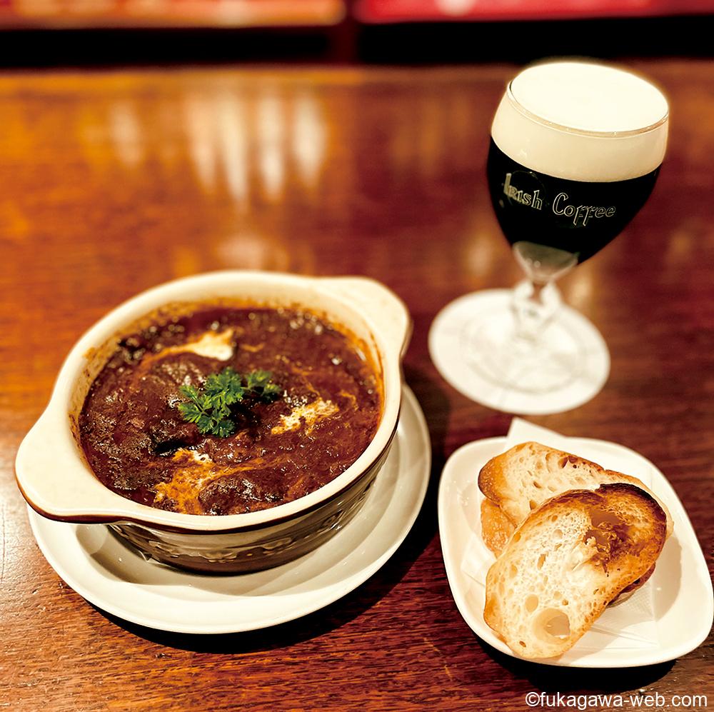 自家焙煎コーヒーの人気店「ピコ」が特別にブレンドしたホットコーヒーとウィスキーをベースに、冷たい生クリームをふんわり浮かべたカクテル。深煎りコーヒーのコクやウイスキーの芳醇な香りが楽しめます。冬季限定のじっくり煮込んだビーフシチューも人気の一皿ですよ。