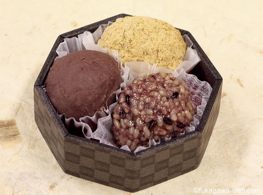 いつもとちょっと違うおはぎを見つけた! 白砂糖を使わずに甜菜糖と玄米を使った体にやさしい玄米おはぎ。きなこ玄米、黒米、玄米の3つの内の一つに幸運の白星に見立てた白いんげん豆が入っている。運試しに食べて見ませんか。「勝運おはぎ」3コ入り420円/予約は2日前の15時迄。