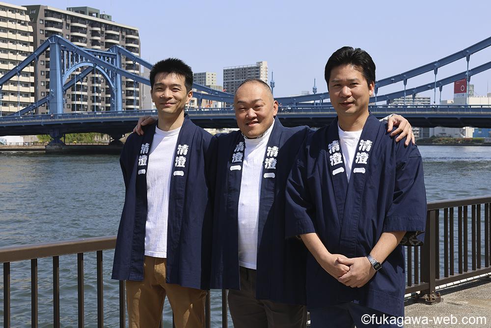 「連合渡御に参加し続けることを目標にがんばります!」と意気込みを語るのは、清澄一丁目の総代となった亀本修吾さん、松本慎輔さん、小林隆一さんの若き3人だ。