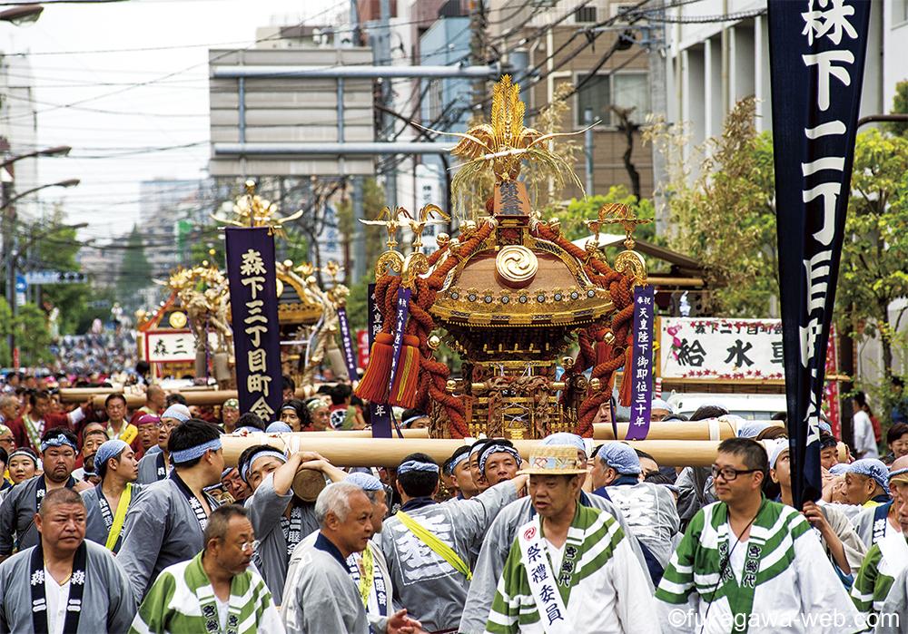 午後は八名川・千歳地区で13時出発、17時帰還。翌日8時からの12ヶ町による町神輿連合渡御は、盛大な水かけと威勢の良さに注目。正午に清澄通り(高橋交差点〜森下交差点)で行なう大手締めは必見。