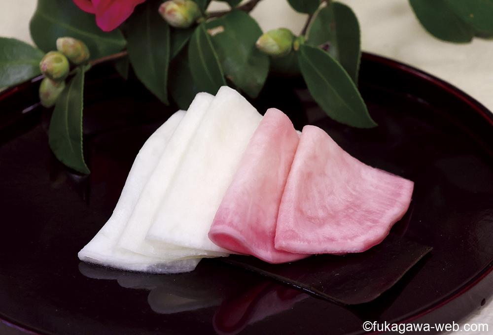 昔ながらの重石製法で手づくりする老舗の千枚漬は、京野菜の聖護院かぶの自然な甘みと昆布のとろみがおりなす手づくりならではの美味しさ。新年にふさわしく赤かぶの紅千枚と詰め合わせてお土産にも。千枚漬140g入864円、紅千枚100g入583円。