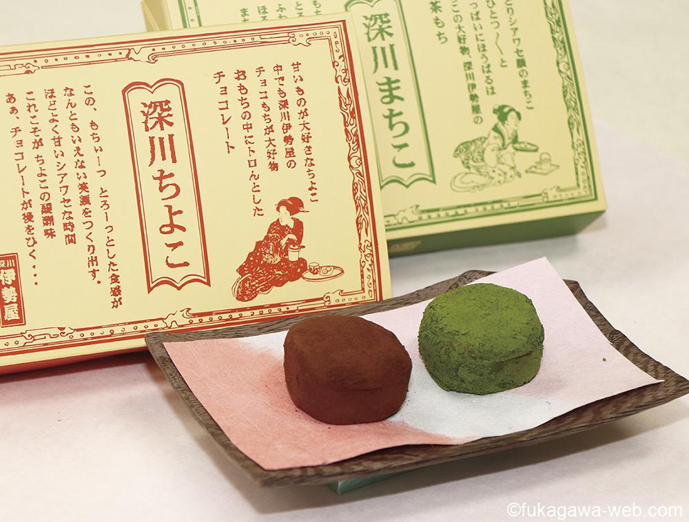 お餅と生チョコがコラボした和洋折衷のオリジナル商品。長女「深川ちよこ」はお餅の中にとろっとした生チョコ入り、次女「深川まちこ」は抹茶チョコ、ほろ苦く爽やかな風味のパウダー仕上げ。好みにより2箱詰合わせも用意。各6コ入720円/2箱詰合わせ1,440円/配送も可。