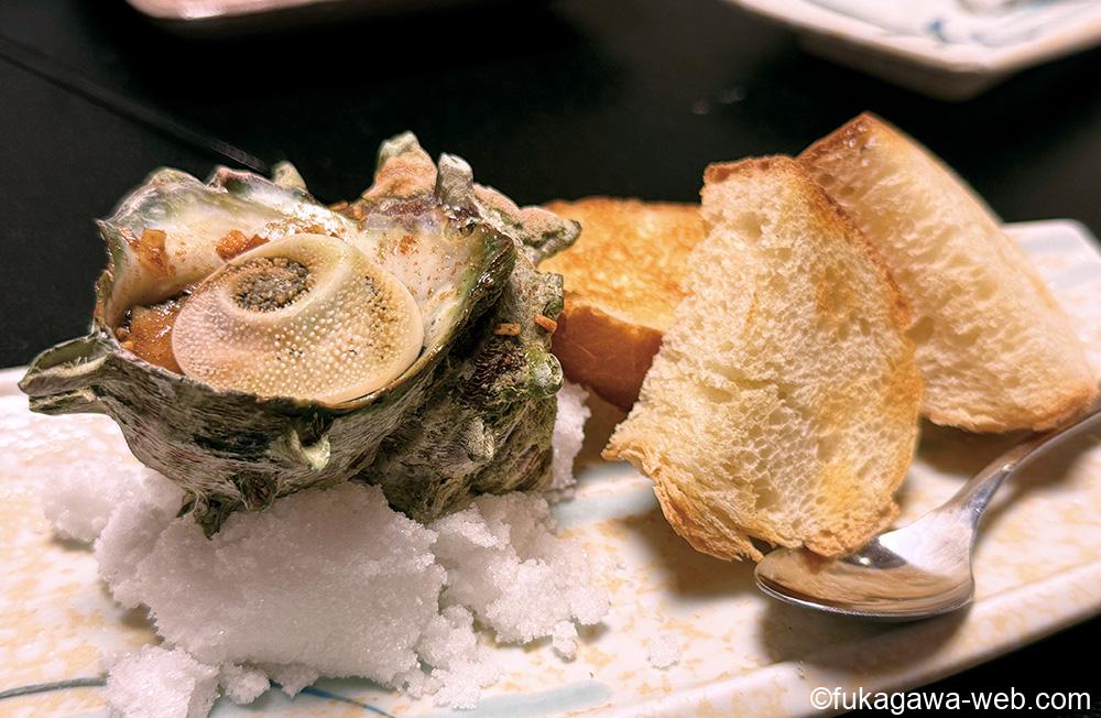 日本料理『味久』の定番の人気メニュー『サザエのエスカルゴ風バケット添え』は、新鮮なサザエをにんにくバターで香ばしく炒め、洋風つぼ焼き風に仕上げた一品。軽く焼いたバケットと一緒にどうぞ。