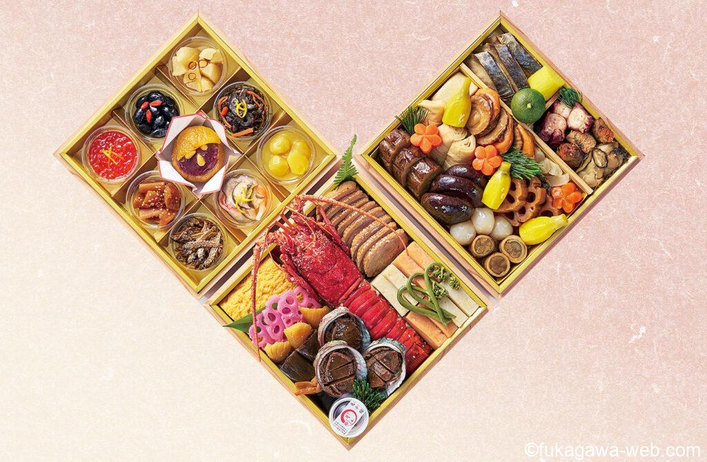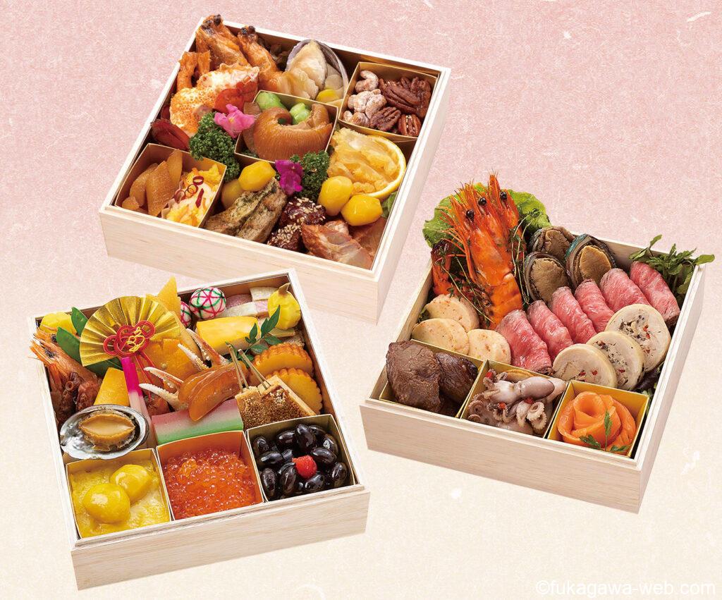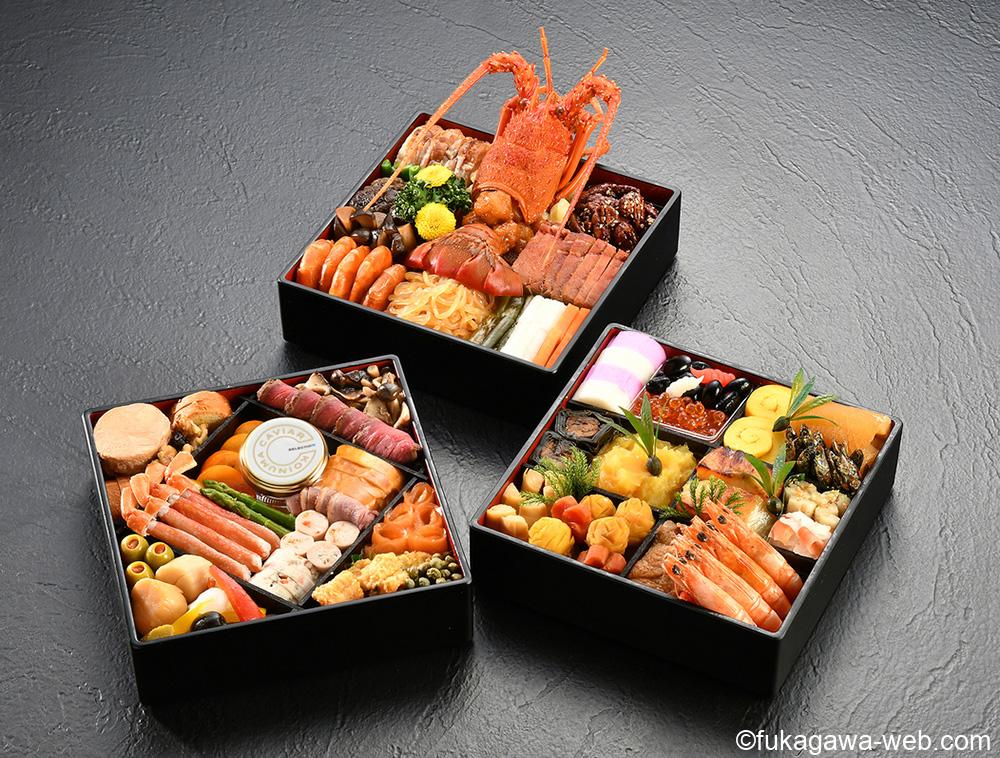 縁起を担ぐ品々の日本料理、フランス料理、中国料理の豪華三段重(4~5名)、全47品目入りの冷蔵仕様59,400円。