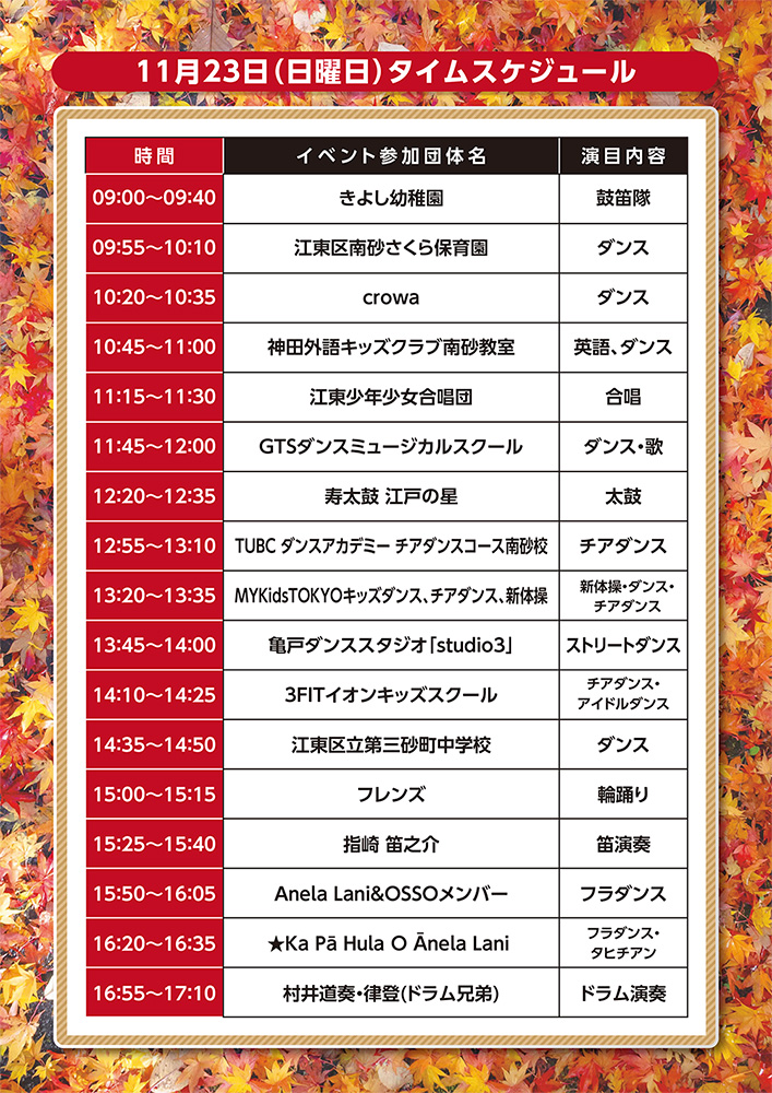 地域の幼稚園・保育園から大人まで、様々なパフォーマンスを披露。また地元飲食店のブースが多数出店するほか警察・消防・自衛隊の車両試乗会やコスプレ撮影も子供たちに人気だ。目玉はニジマスのつかみ取りや食品サンプル制作体験。親子で楽しめる2日間になっている。詳細は公式サイトへ。