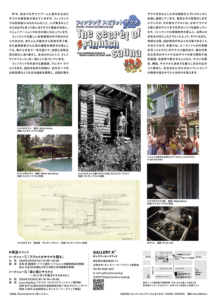 フィンランドを代表する建築家アルヴァ・アアルトが設計したサウナ6作品を紹介。コエタロサウナのインテリアを実寸大で再現する他、6作品の図面原画9点などの展示を中心に、生活文化に欠かせないフィンランドの精神が宿るサウナとは何かを考える。