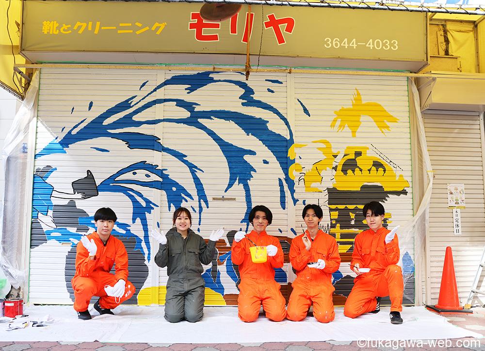 制作したのは、芝浦工業大学(江東区豊洲)の地域デザイン研究室(志村秀明教授)の学生たち。2030年代半ばに豊洲から住吉まで延伸予定の地下鉄8号線まちづくりの一環として、学生たちがシャッターアートを提案。商店街通りが"美術館通り"の愛称で親しまれていることもあり「アートで商店街を盛り上げたい」という思いから計画がスタート。