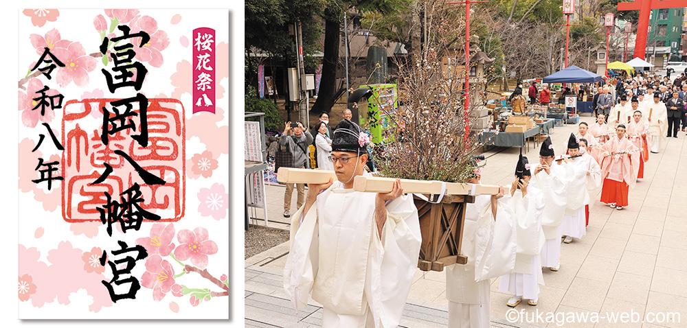 富岡八幡宮で3月29日(日)15時から。桜の花を身に付けた神職や巫女の行列や祭典。3/20から桜花祭の限定御朱印を授与。(御朱印は無くなり次第終了)