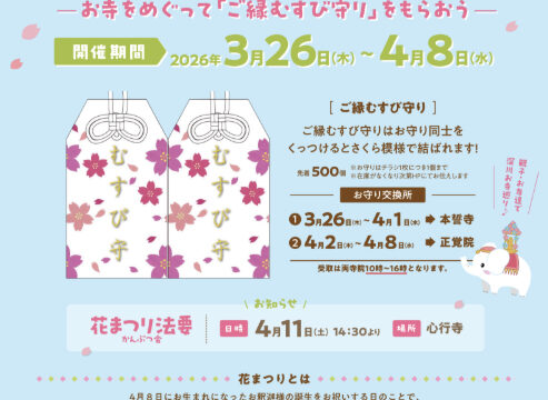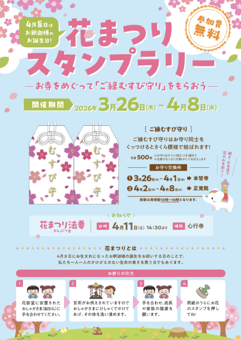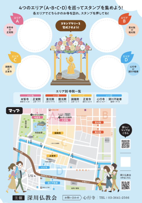 3/26(木)~4/8(水)は恒例のスタンプラリーも開催。深川仏教会の寺院をめぐって「ご縁むすび守り」を授かろう!深川の4つのエリアにスタンプを設置。各エリアで1つスタンプを集めると、花まつり「ご縁むすびお守り」がいただけます。