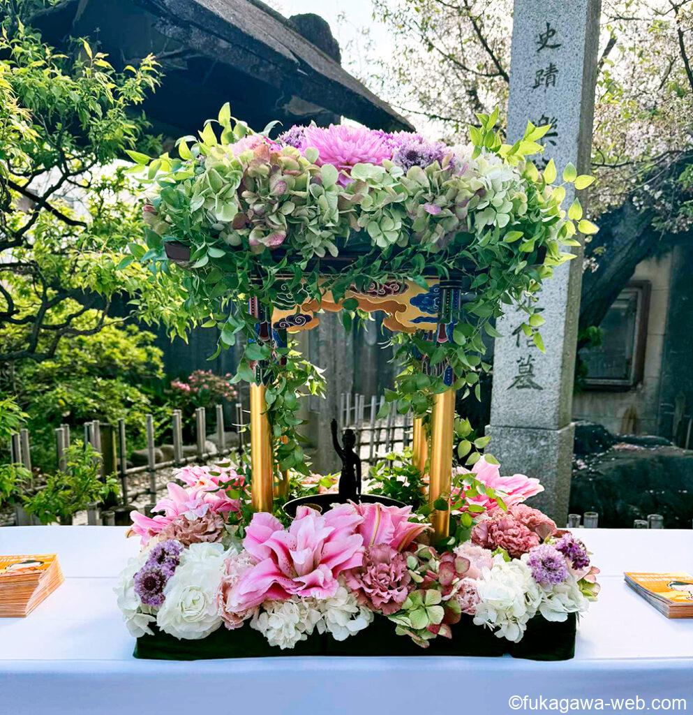 花御堂に甘茶をかけてお釈迦様の誕生日を祝い、深川の51カ寺が合同で灌仏会(かんぶつえ)法要を行ないます。【4月11日(土)/14:30〜/心行寺境内】