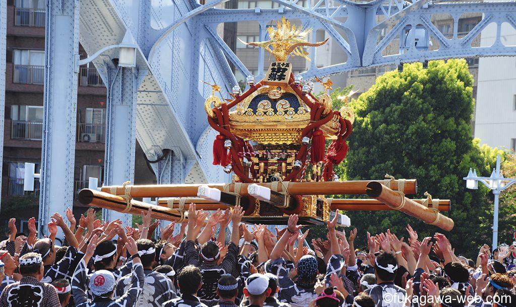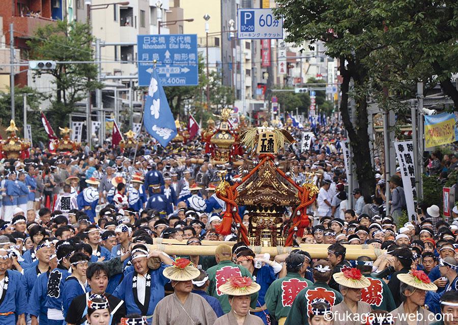 早朝、富岡八幡宮の氏子中から53基の町神輿が八幡宮前に集結。大鳥居前では神輿総代と鳶頭衆が木遣りと一本締め。その後、神輿総代会長が道中の安全を祈願して盛塩を踏むと、8㎞にわたる神輿連合渡御のスタートする。神輿を担ぎあげる総勢2万5000人の担ぎ手たちの歓声が、うねりとなって深川の町にこだまする。